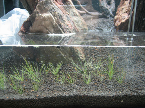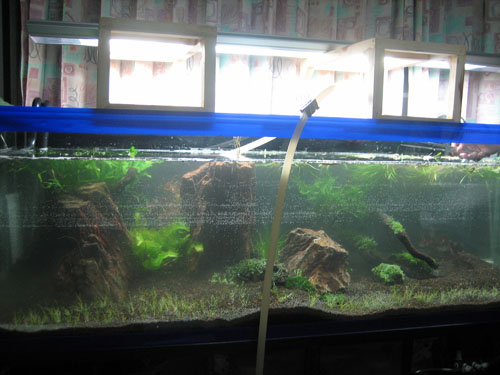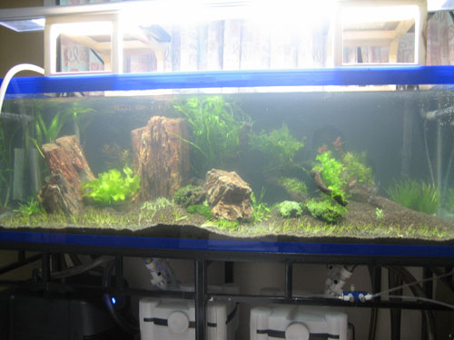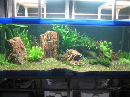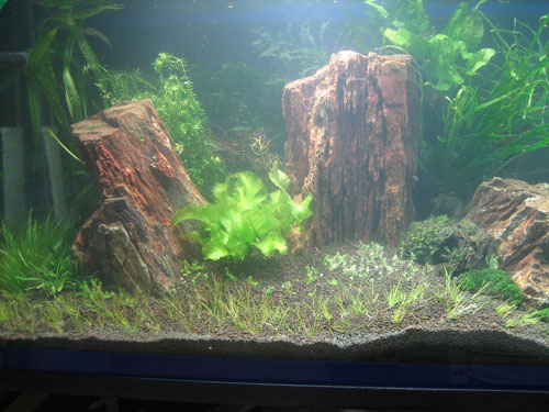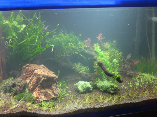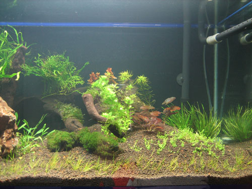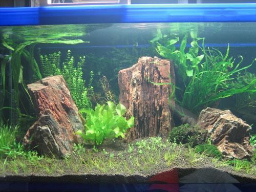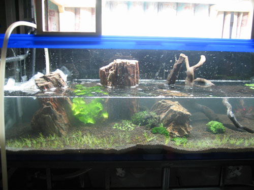 ปักไม้เริ่มเต็มแล้ว น้ำก้อเริ่มเต็มตุ้ด้วย ....จากภาพกว่าจะเอาขอนไม้ติดเฟิร์นลงได้ แทบตายเพราะหลังยกมาติดแล้วเอากลับลงไป บังเอิญดินหนาบวกกับพันไม้สูงไปพ้นน้ำเลย ต้องยกกลับออกมาตัดส่วนล่างของขอนออก ...กรำ [แง๊งงง] ...แถมเอากลับเข้ามาวางไม่เหมือนเดิมอีกจากตอนแรก...กว่าจะเข้าที่เสียเวลาไปเยอะแถมดินฟุ้งด้วย น้ำขุ่นานเลยกว่าจะเริ่มลงไม้ต่อได้