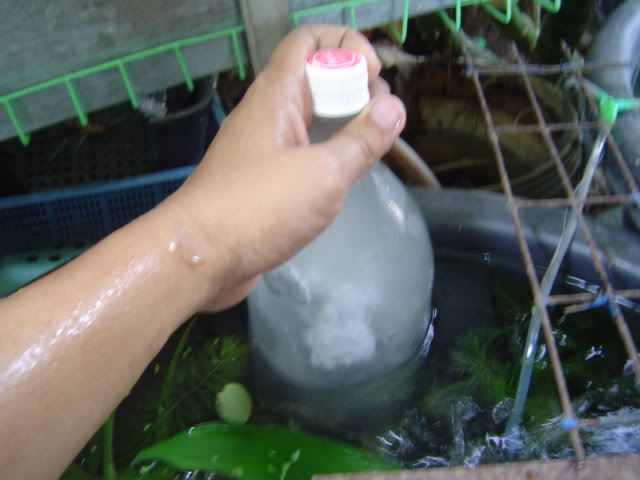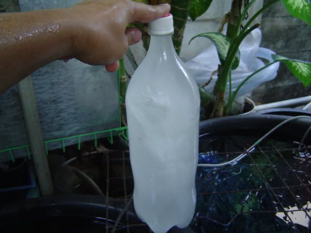 1.โค๊กลิตรเบอร์ใหญ่ที่สุด ใส่เกลือลงไปในน้ำ ประมาณ 1 / 4 ของขวด เขย่าให้ละลายให้หมด แล้วนำเข้าตู้เย็น