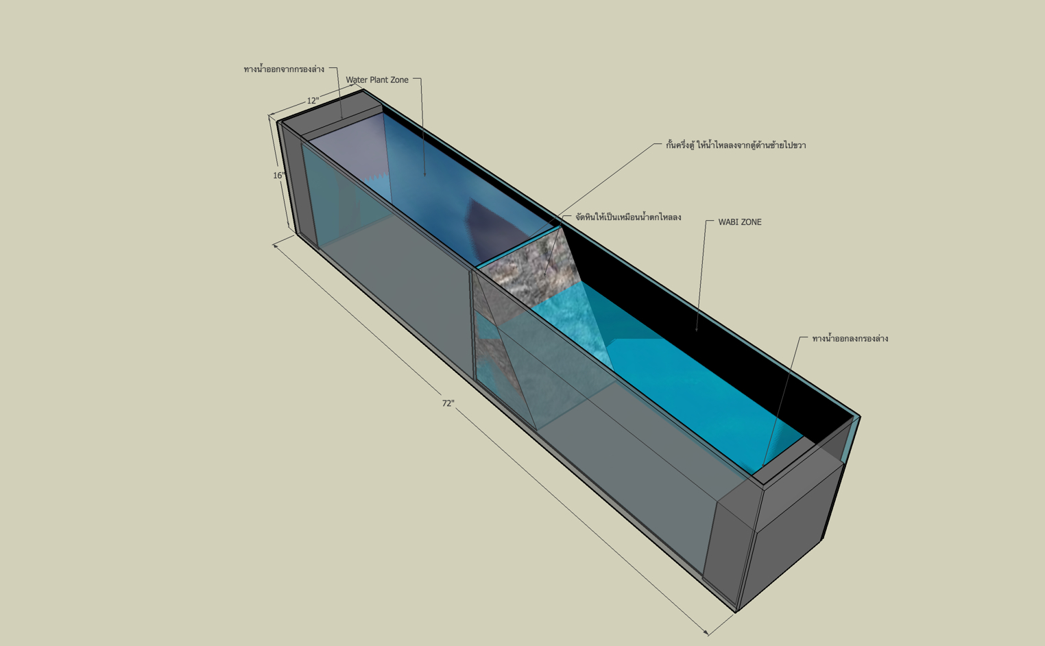ผมกำลังจะตั้งตู้ 72x12x16 แต่อยากแบ่งครึ่งตู้ทำเป็นตู้ไม้น้ำครึ่งนึง แล้วนำ้ไหลมาอีกตู้ที่เป็นครึ่งบกครึ่งน้ำอีกตู้นึง ไม่รู้จะโลภมากไปไม๊ รบกวนช่วยเสนอแนะหน่อยครับ