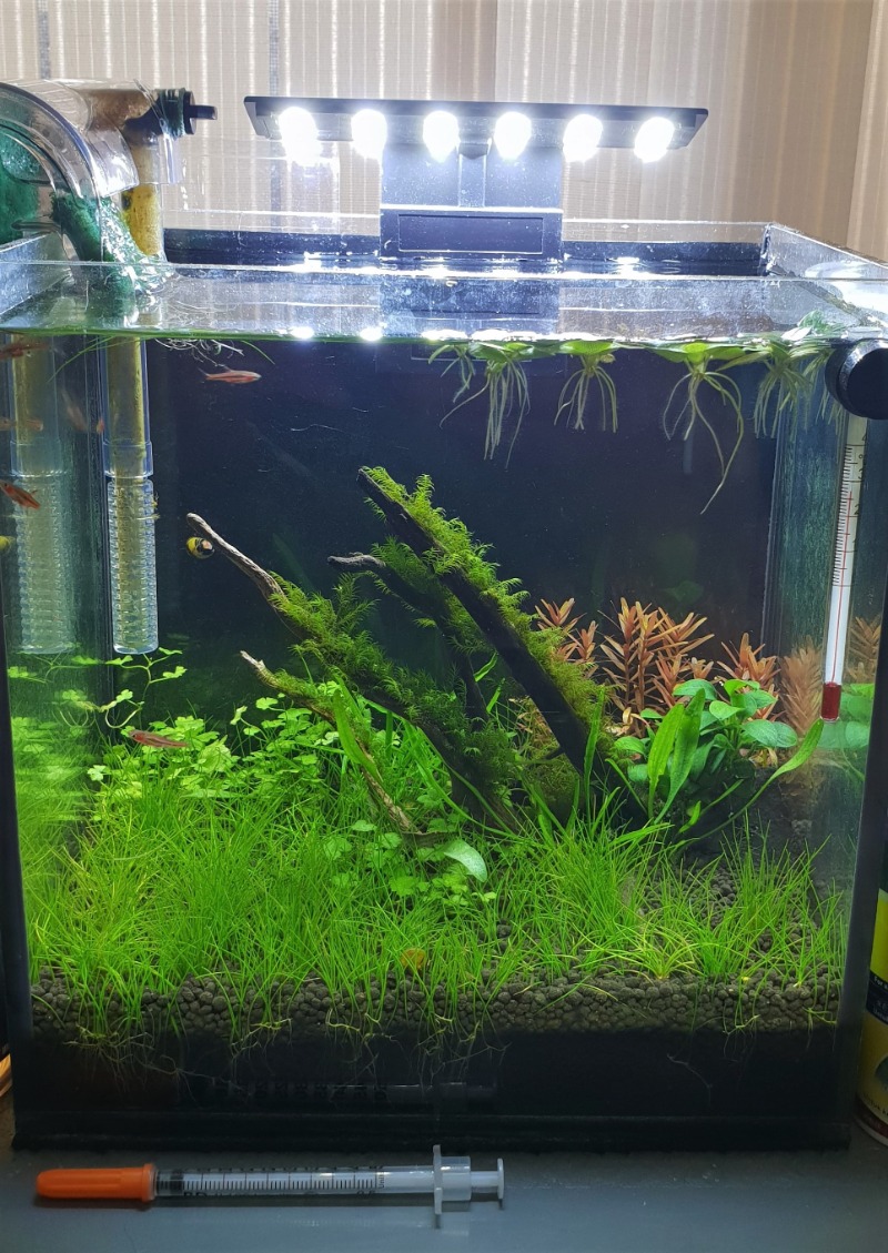 แล้วจะลงพวกที่ใบเป็นก้านยาวๆ ดูเรียวๆแหลมๆอย่างพวก echinodorus xingu หรืออย่างอื่นที่คล้ายๆกัน กะให้ความสูงปลายใบแตะผิวน้ำพอดีหรือพ้นน้ำเล็กน้อย บริเวณหน้าท่อน้ำเข้าให้บังท่อไปเลย อย่าใช้ต้นไม้ใบใหญ่จะยิ่งทำให้ดูอึดอัดดูทึบเอาที่เรียวๆ แหลมๆยาวๆเป็นหลัก ปรือจะลองหาพวก cryp ที่หน้าตาและความสูงประมาณนี้ก็ได้ หรือจะ go dutch ก็ลองพวกหวีดสามใบ ไม่พุ่มใบเล็กๆ อย่าไปเน้นพวกใบใหญ่เพราะตู้เราเล็กมันจะดูคับตู้
