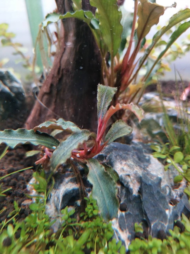 ส่วน   Bucephalandra sp. Kedagang  ต้นนี้ รู้สึกว่าใบมันจะเริ่มออกสีตามฟอร์มของมัน เห็นมีแตกใบใหม่ใกล้ๆรากด้วย มีการเจริญเติบโตแสดงว่ารอด 55555 ผมย้ายมาพันหินตามคำแนะนำครับ (ตอนแรกเอาฝังดินเฉยเลย ทำท่าจะไม่รอด)